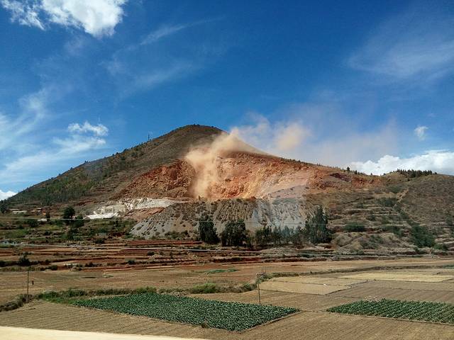 远远望见以为是风沙,其实是在挖石开矿。既要金山银山,也要绿水青山……