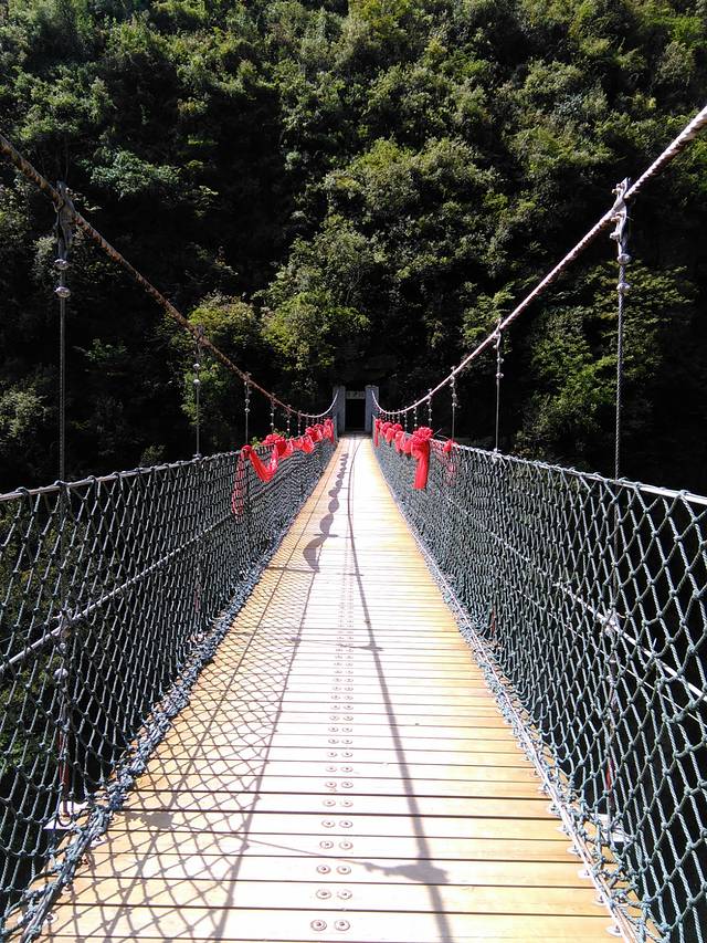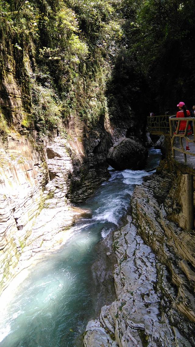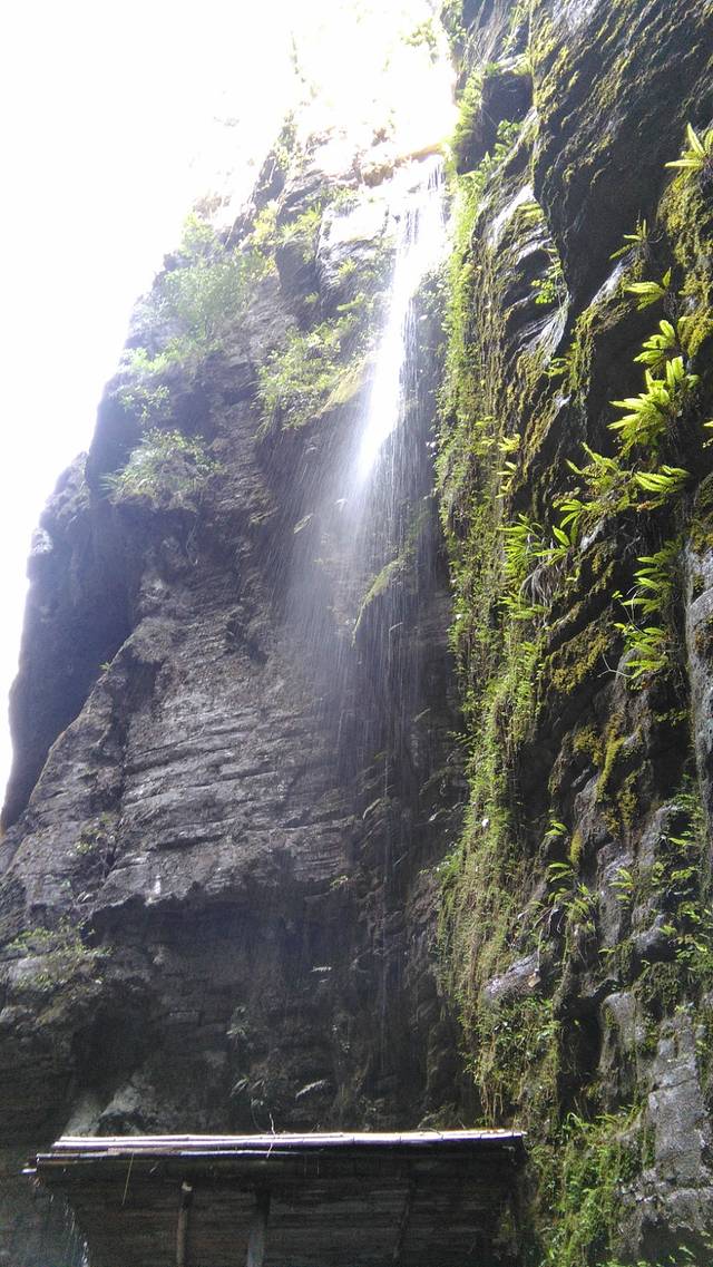 溪水激荡,山瀑肆射。恰似人在河边走,却能不湿鞋。七里下河谷,七里上天梯。峭壁一乔木,时扯游人衣。