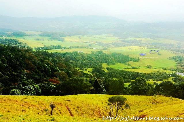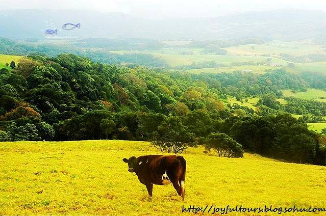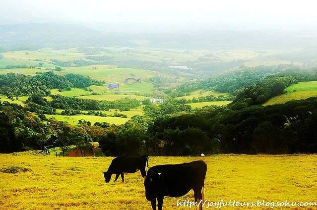 一早开车离开Kiama,今天无风,天气很好。特意去昨天壮观的海喷泉看一看,结果今天的一切竟然和昨天迥然不同!温婉的大海平静如水,没有一丝昨日海喷泉曾汹涌喷发的迹象,大自然真是奇妙啊。 今天的目的地是堪培拉,车程仅3个小时。路上我们顺带游览了田园风光浓郁的Saddleback Mountain。一进入这片山区,就雾气朦胧的,显然昨夜这里下过雨。空气里润润的雨后泥土芳香,漫山遍野的郁郁葱葱和金黄色,悠闲游荡的牛儿,恍然间竟如闯入了一片世外桃源。