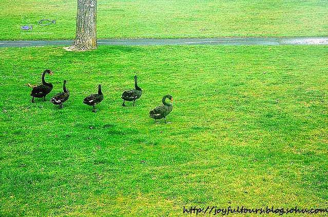 绿草地上,蹒跚行走的黑天鹅,它们是一家子吗