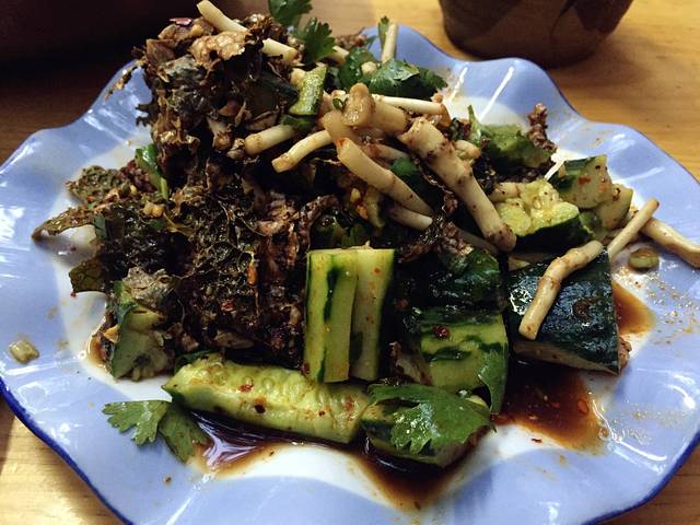 【凉拌树皮+鱼腥草+黄瓜】大理人吃野味树皮和树花,都是生长在树上的,尝尝鲜,味道凭心而论不咋滴,鱼腥草自己很喜欢吃,云南很多,口味有点辛辣...