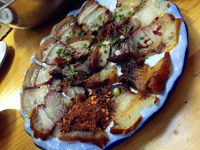 【凉拌生皮】生皮是生的,猪杀后,一般用松毛烧掉毛,然后用热水洗尽,这样猪皮金黄,肉质细嫩,可以打蘸水吃,老板告知如上图凉拌的更入味喔~