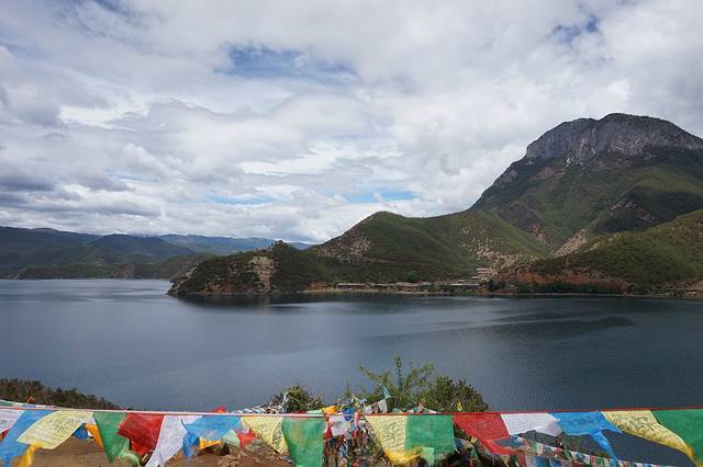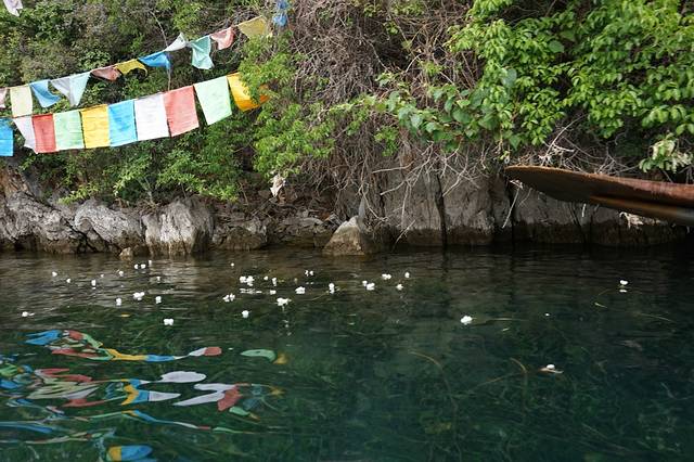 经幡倒映湖面,水性杨花飘在湖面。这种花不知学名是什么,长在较浅的湖边。早起时刚看到一时惊到了,以为是什么碎泡沫,后来看清楚了才知道是一种花,长在湖底,白色的花朵飘浮在湖面上。