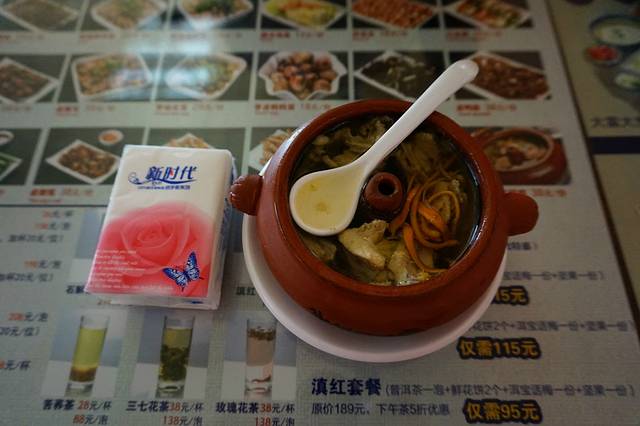 在昆明机场转机时我点了一个超小的汽锅鸡,老公点了一大碗过桥米线,味道还不错