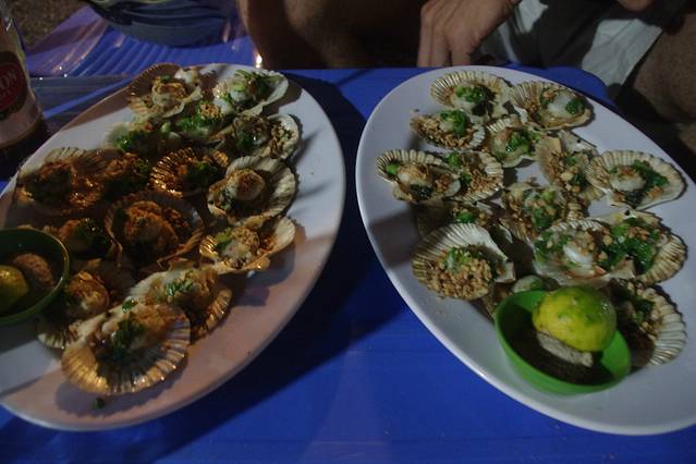 抱着货比三家的态度一路走走看看,中间40美金一公斤的生猛青龙让人恋恋不舍,最后那家活墨鱼更是把我定住了,价格也是让人没有办法离开。活墨鱼13万一公斤,跟老板磨蹭了一下,只剩下美金了,给个整数好了,老板终于同意给我12万的价格了,别的地方死的都要16-18万呢,大家要擦亮眼睛了!6万一公斤的扇贝,他们家的螺倒是有点贵,百威同学要了一个诡异的黑底橙斑螺,6万,这个应该有被宰了,算了,反正老板赚得不多,我还要老板送了一个奇怪的小螺吃吃看,饮料照例是最爱的芒果汁和木瓜汁,一万一杯!过不多会儿就上菜了,先是扇贝,太喜人了,整整两大盘,三十个出头,折成人民币才二十块,这个愉悦感太强烈了!吃了一会儿,大爱的烤墨鱼紧接着也上了,三只整整切了两盘,肉质非常Q弹,让人欲罢不能。活墨鱼的味道是截然不同的,现在想想都还是觉得很幸福:)6万的那个大螺在吃过烤墨鱼之后就逊色多了,若是平时吃起来一定是兴致盎然,但是这时候就发现差得太多了。一餐吃下来,我是1.1公斤墨鱼14万,1公斤扇贝6万,两个果汁2万,一共22万,70人民币左右,但是是两人份的,又收获无上的幸福感,太值了!以前别人卖200一斤的活墨鱼我也吃了,现在这价格简直是天边的一抹浮云,才一个打车钱,如果早发现就好了……ye