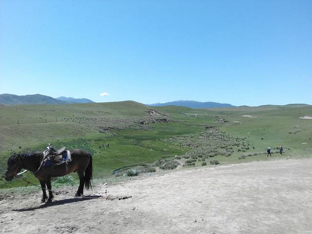 再来到金银滩草原,一望无际,当年王洛宾创作《在那遥远的地方》的草原,远处天很蓝,这边草很绿但是矮矮的不是风吹草低见牛羊的感觉。马也是被拴住用来拍照,烈日暴晒之下还悠闲。发现这边最多的是狼毒花,人们喜欢把藏獒的标本模型放在家门口,辟邪么。上车后要赶紧涂防晒,全程长衫长裤帽子墨镜,所以带了很多短袖也是错误的,导游说不是爱美、美白,而是这边紫外线强,如果暴晒后会脱皮,脸上脱皮是很恐怖的啊,还有高原红。
