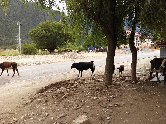 回程还是有点高反想吐,幸亏克服过去了,这边经常见到很多牛羊啊,牦牛神马的,还有拿藏獒出来拍照收钱的,真正的藏獒说不是这么小一只,很忠心。这边路上不好的就是厕所要收费,为什么我们援藏帮忙盖房子却还要收费呢,而且这边限速,通常不是很远的路都能走一天了,直路限速70,拐角限速40,能不走一天么,只要离开拉萨,就会有民警跟车保驾护航。(但是在车上吸烟这样真的不好,导游也不能拿他怎样,请有关ld管理吧)