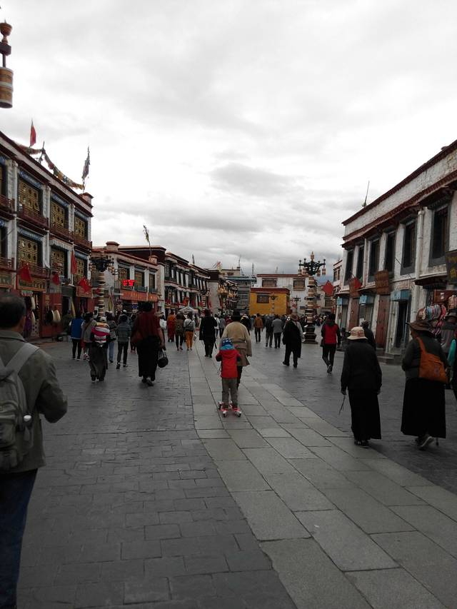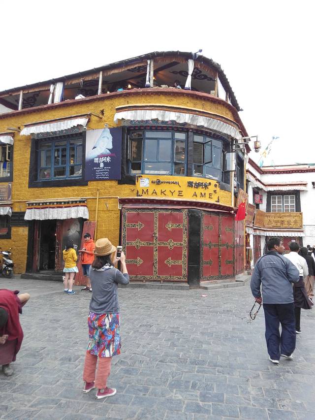 本来导游说应团友要求去看牦牛肉干厂,藏药厂还说要带去吃美食(他居然不载我们过去大昭寺那边),我们按路线上说会去八廓街自由活动的,所以要求他赶紧路过放下我们自己去,不要浪费我们的时间。来到拉萨了,怎能不来这里呢,我们一路过去还看到大昭寺很多三跪九叩的人们,顺时针沿着八廓街转经道。八廓街不像其他旅游购物街,不能在门口摆卖,没有那种购买的气氛。拍了清政府衙门和玛吉阿米,玛吉阿米吧人太多很挤就去找吃的。