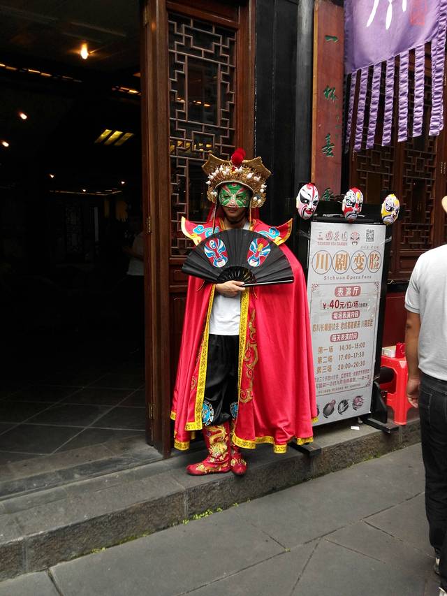 才下午2点多,还来得及去宽窄巷子,其实是居民楼后面的一条街,本来住人的,历史慢慢发展成旅游景点,比较安宁小资情调,树也比较多,后面街两旁有些批发的卖得比较便宜,不能看变脸就给自己买了个脸谱水果叉,挺可爱的。