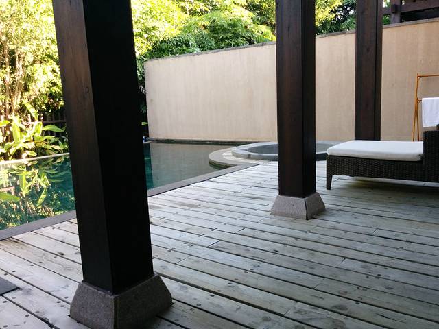 我们预定的是两套碧澜居别墅,房间面积大约80平米,包含一个卧室。前后各有一个小院,前院有自己私人的小泳池和有按摩功能的温水泡池。 这种房型属于比较便宜的,大约每套1500一晚。预定时曾经纠结过,要不要定带大私人泳池的顶级房。事实证明定碧澜居是对的,因为酒店有两个巨大的公共泳池供我们享用,而且没什么人,与私人泳池无异。