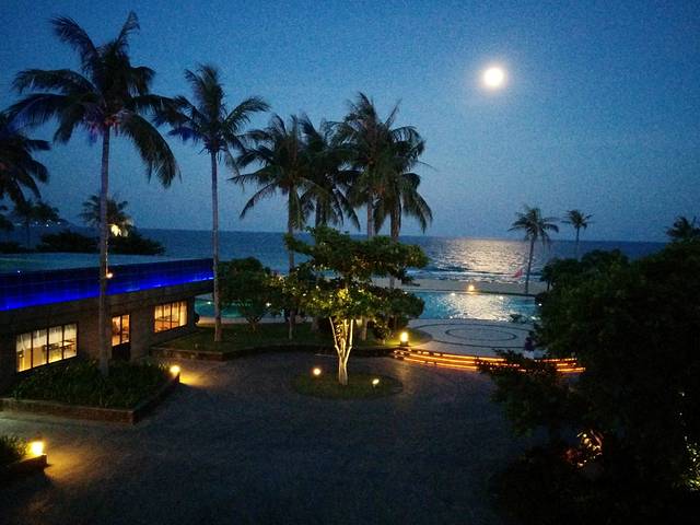 第二天在酒店里各种玩,傍晚还放飞了我特意带去的大疆无人机,进行了航拍。航拍的画面美得让人吃惊。晚上在西餐厅的大露台上吃完饭,月亮从海面升起,月光洒在海上,波光粼粼。晚饭后在无边泳池里享受夜泳,太享受了。