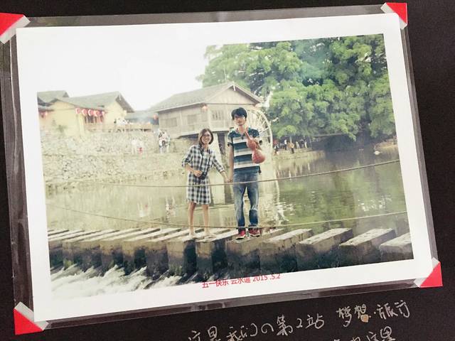 沿着溪岸一直走,过石子桥,这应该也是水车后第二个大家去比较喜欢拍的照片,人太多,拍着队过桥,不好拍,让那里的速洗给我们留了一张合影纪念。我还是挺喜欢速洗的,和极品的合照,基本上都是让速洗拍的,又不贵,而且拍着效果也还过得去。