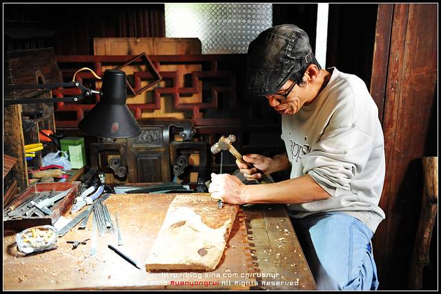主人的工作室就在天井的左侧的偏房里(从布局看,这件小屋应该就是老宅以前的伙房吧),随着房中叮叮咚咚的声音,走进潘木匠的工作室,大师没抬头,他正在专注于一块木板的雕刻。。。