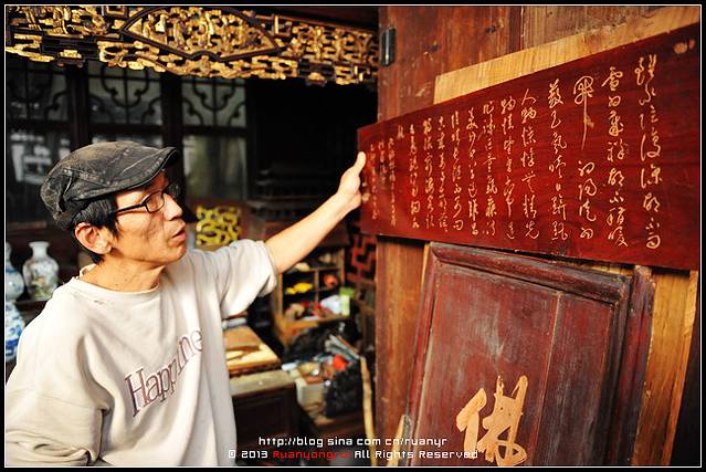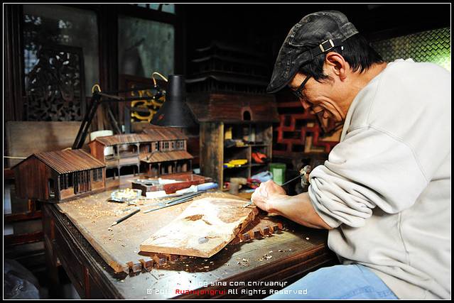 木匠潘、潘木匠,不管你怎么叫吧,这都是在同里古镇响当当的一个代号。潘老师,50岁出头、60岁上下,情报显示其人是77届同济大学土木工程建筑设计学毕业,现在是华东建筑设计院的教授(其实应该叫潘教授才更礼貌一些),据说潘老师在2000年来同里旅游,就再没有抛下这个原滋原味的古镇,他在古镇富观街租下了一座非常不起眼的老宅,没有从俗去改造成客栈或是茶楼,而是毫不修饰的在里面开始一边用刻刀雕刻自己心中的古镇,一边收藏遗落古镇民间的建筑工艺珍品,并且将一栋破败的古宅逐步拓展成了一座小小的博物馆,自己给它起了一个名字:“古建筑遗珍馆”。