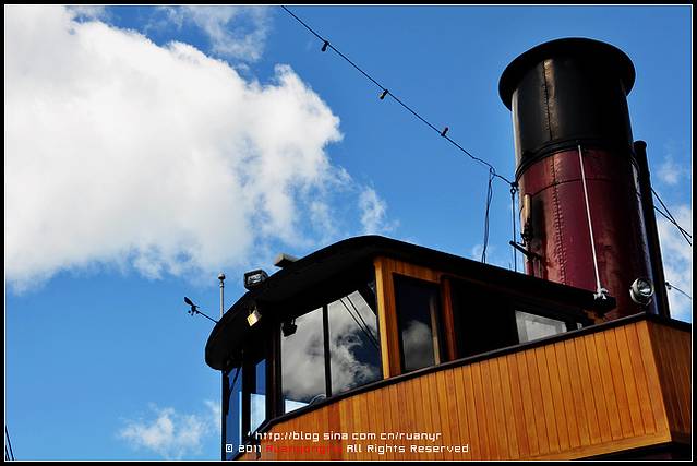 湛蓝的天空下,木质的舰桥、黑漆的船顶及烟囱也是一道色彩的风景线