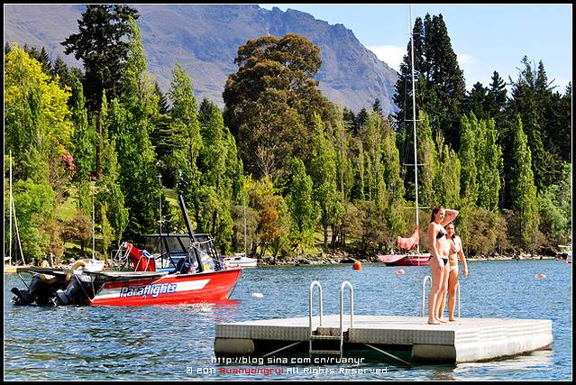 皇后镇是一个被南阿尔卑斯山(Remarkables)包围的美丽小镇。初夏的皇后镇百花盛开,蓝天艳阳下,远山尚未融化的积雪与天际的白云接为一体;镇前闪烁着翡翠般蓝色的瓦卡蒂普湖(Lake Wakatipu)就像是一大颗镶嵌在山环上的大宝石,把整座皇后镇点缀的熠熠生辉。