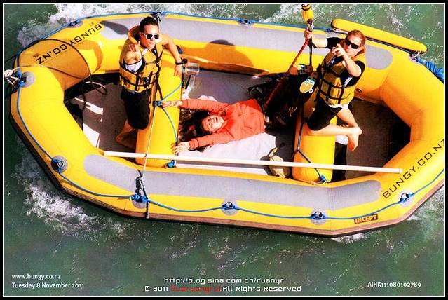即将起跳,脚下是湍急的河水,同行的美女故作淡定的冲着镜头摆着POSE,这是起跳前必有的一个环节,算是“最后的表情”吧,哈哈!