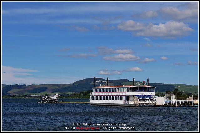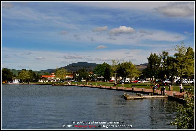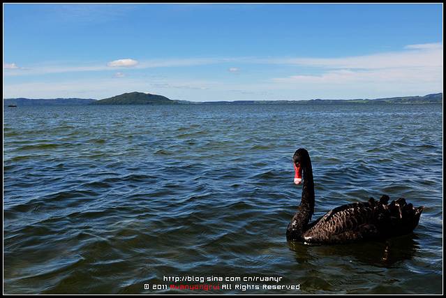 也许我感慨罗托鲁阿湖美呆了,很多到过新西兰的朋友们会来质疑我的观点,你们会说在新西兰南岛还有更美丽的湖泊。我并不否认这个说法,但是,罗托鲁阿湖的美丽是别致的,平静的湖水被周遭并不险峻的起伏丘陵包围,曲线柔和,与天际相接,大群的黑天鹅在镜水中优雅的游弋,这与南岛上藏于峻岭间的湖泊形成了鲜明的对比,就像是一位柔美的少女和另一位英俊少年之间的隔海相望,走在罗托鲁阿湖畔,心境淡定从容,完全被包容入湖景之中了。。。