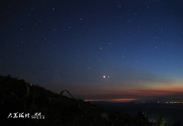 放到地上向西拍去,落日的余晖还能映衬的天际,中央最亮的两个星,是当前金星和木星相靠在了一起。