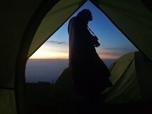 凌晨4点,就被喧闹的声音吵醒了,大家争先起来,奔向东方,欣赏最美的海坨日出。这次天气很好,早上的风应该只有2级,但还是有一点冷意,穿好冲锋衣起来拍了两张照片后,还是把睡袋裹在了身上,等到4点半左右的时间,天边慢慢变成了金色,于是我们准备好了迎接今天的太阳。