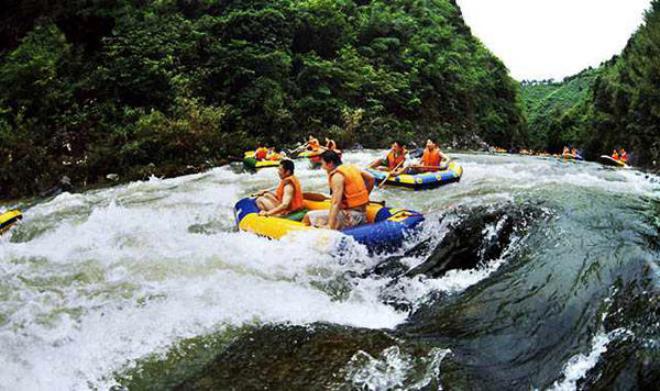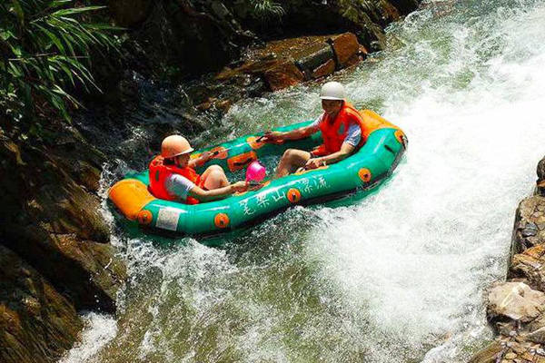 我们先在网上订了票,所以来了景区就不用那么麻烦还要去买票。我们换好泳衣,领了救生衣和头盔穿戴整齐,开漂的人已经尖叫着呼啸而下,感觉好刺激。我们排了十多分钟队才上去,橡皮艇是从一个亭子上面滑下来的,我们5个人自行找橡皮艇坐上去,然后工作人员检查是否坐好后,就一个一个放下漂流的水道。开始90分钟左右惊险刺激的漂流之旅。因为漂流的时候不能带手机,这里就只能附上网上的图片了。