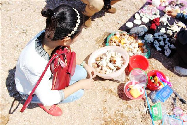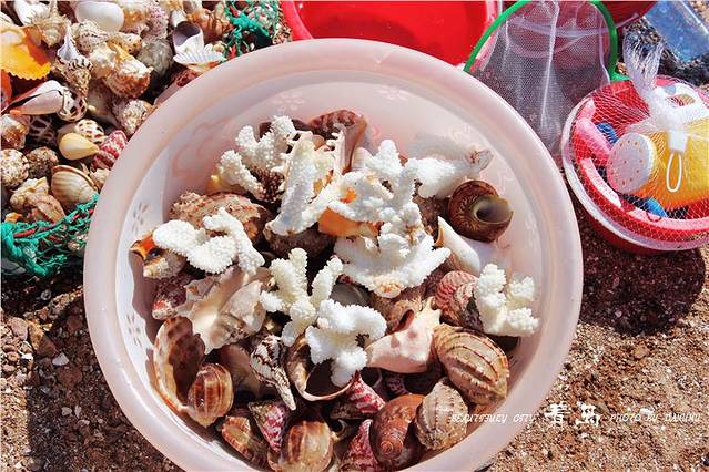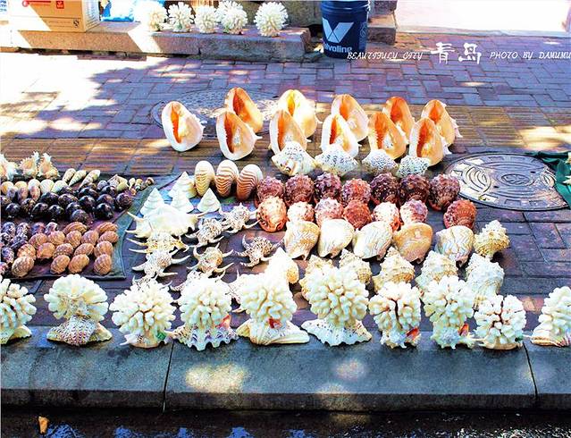 从栈桥到第一浴场去的道路上,已经有好多海滨城市的特色在路边摆着小地摊,海螺,贝壳,珊瑚礁等等。