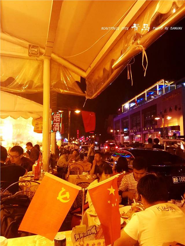 每家店都有服务员在外面热情的招待客人,其实是拉客。饭店的风格都大同小异,大部分人都喜欢坐在店外延伸出来的作为,随意找了一家,坐下来,因为实在是饿了,青岛的美食,无外乎各种海鲜,果然海边的海鲜就是美味。白天一路上吃了不少鱿鱼,路边摊上的鱿鱼都很美味,忍不住一路吃了好多好多。
