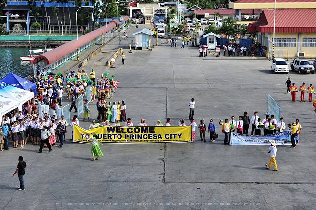 巴拉望公主港就跟过节一样,码头上组织了盛大的欢迎仪式,身着红装的少女们挥舞旗帜载歌载舞,打着各式欢迎标语,据说,因为当地接待能力有限,专门还从菲律宾首都马尼拉临时抽调了大量车辆和导游人员上岛来接待我们。