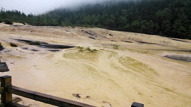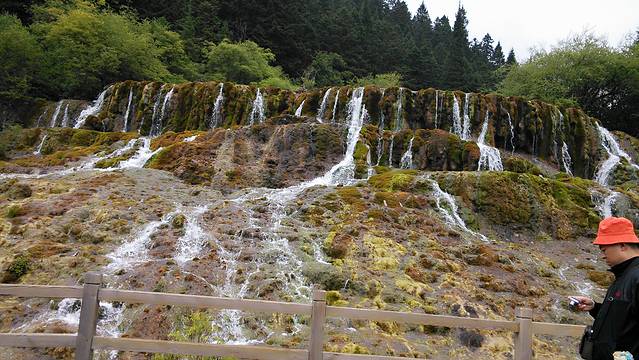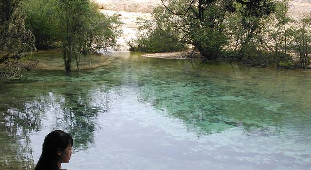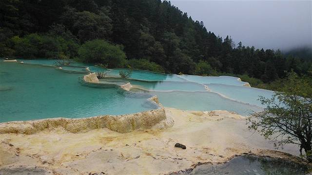 两点多的时候我们到达了黄龙景区,景区主要的几个景点:望龙坪、迎宾池、蓬台飞瀑、金沙铺地、明镜倒影池、争艳池、飞瀑流辉、流身洞瀑布、盆景池、婆罗映彩池、五彩池,因为水质的原因,石头也都是黄色。大部分景点的景色的相似,黄龙的水真的很漂亮。可惜运气不好的我们遇到了下雨,所以黄龙的能见度很低,平时五颜六色的水也黯淡无光了,即使这样,黄龙依然是很美的。