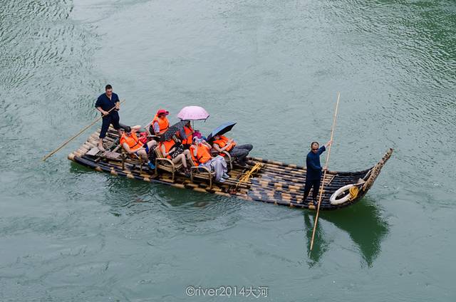 去天游峰横跨九曲溪,从桥上就可以见到许多来来往往的竹筏了,这样的一条竹筏可以乘坐6个人。