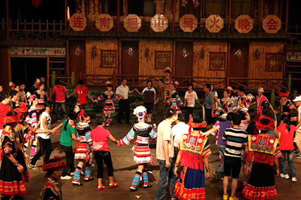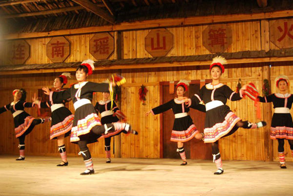 篝火晚会表演是7点到8点左右,表演的节目是以“瑶族舞曲”、“耍歌堂”、“长鼓舞”为主题的一系列瑶族歌舞节目。