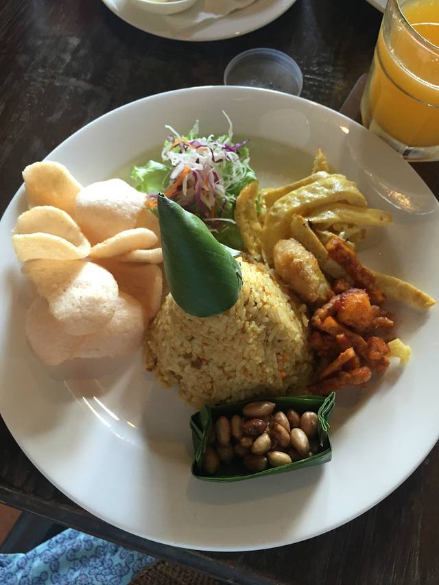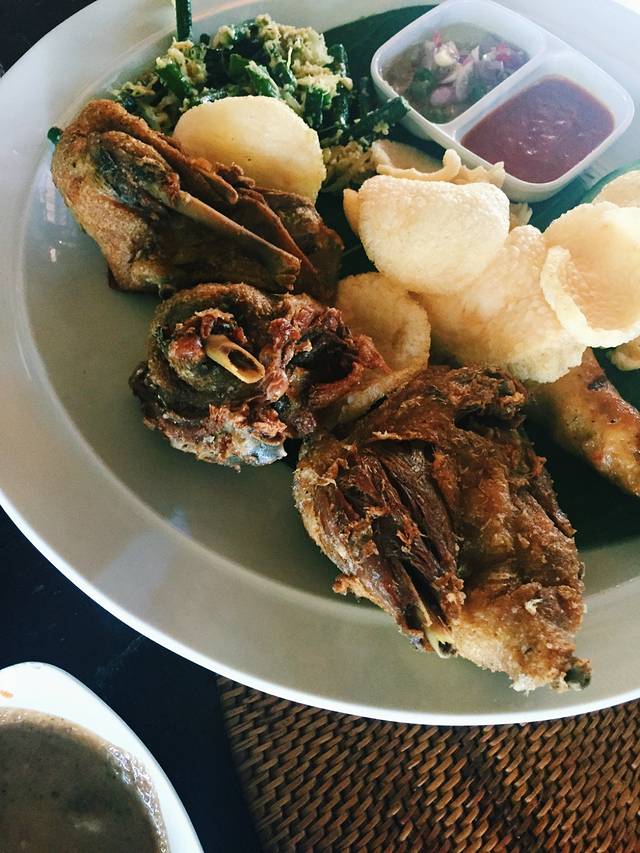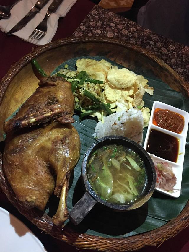 吃到了传说中的脏鸭餐,因为我本身不吃鸭子,觉得鸭子有味道,包括北京烤鸭、鸭血粉丝任何鸭肉都不吃,包括鸭蛋。但是脏鸭真的没问题,一点味道没有,其实就是炸鸡的口感,比较酥脆,很喜欢哦~巴厘岛有名的菜还是值得尝试。