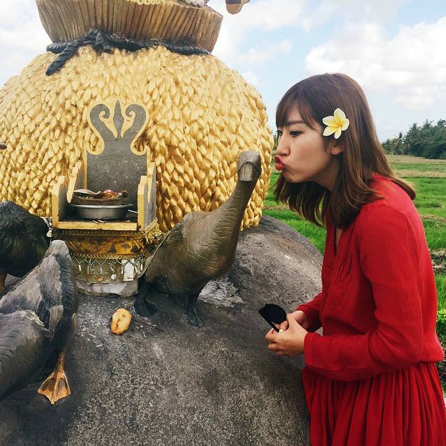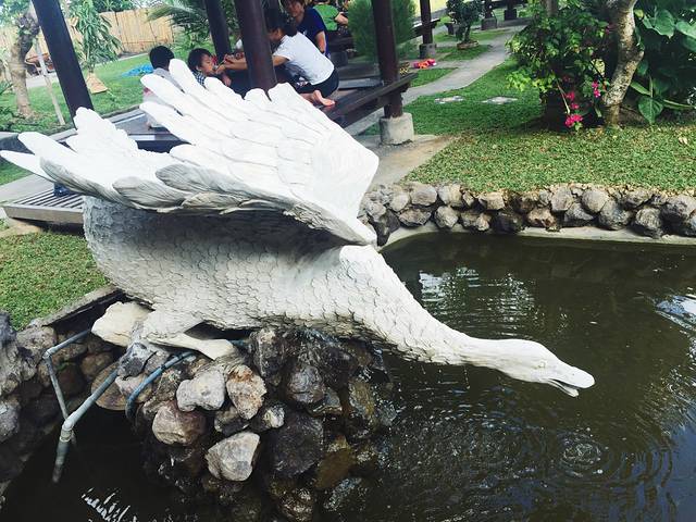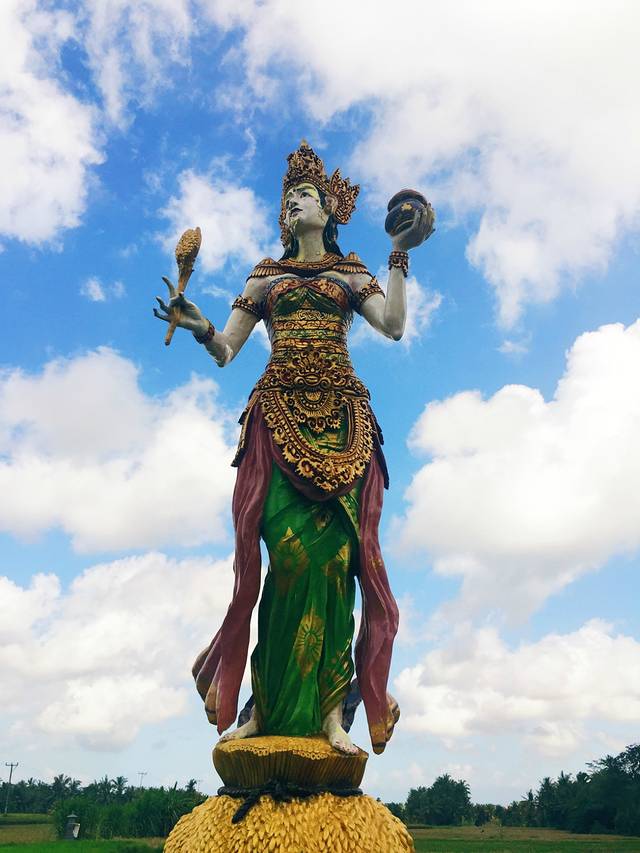 因为在车上移动的时间还挺长,9点出发的也不算早,到了中午吃饭的时候跟司机师傅说了,他带我们到了乌布一个应该比较有名的餐厅吃饭。餐厅后面就是稻田,还有一个女神像,他说那是水稻女神。