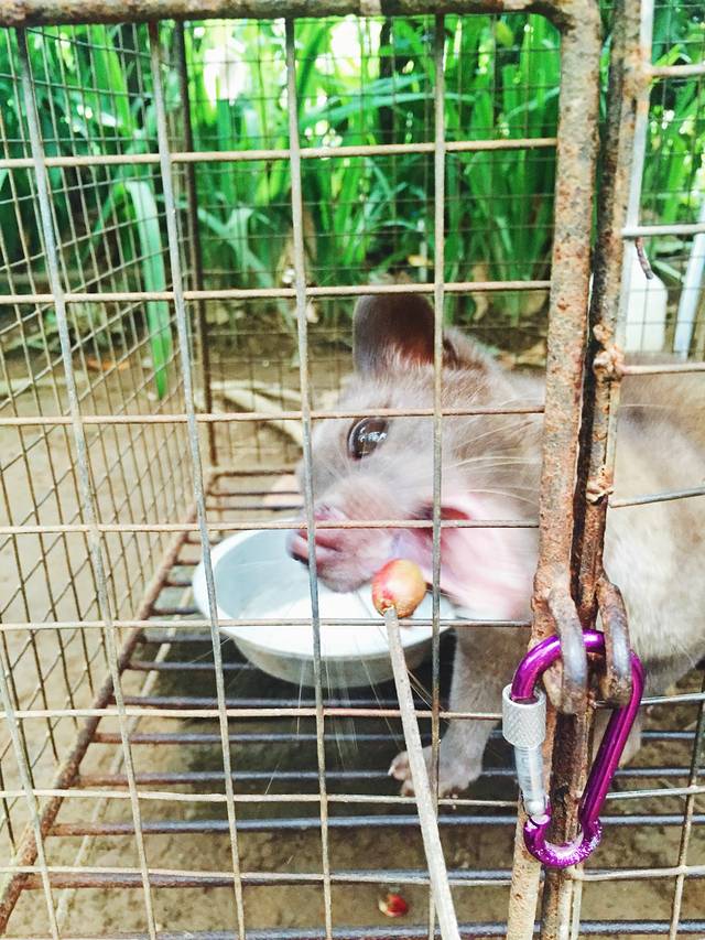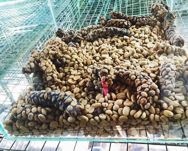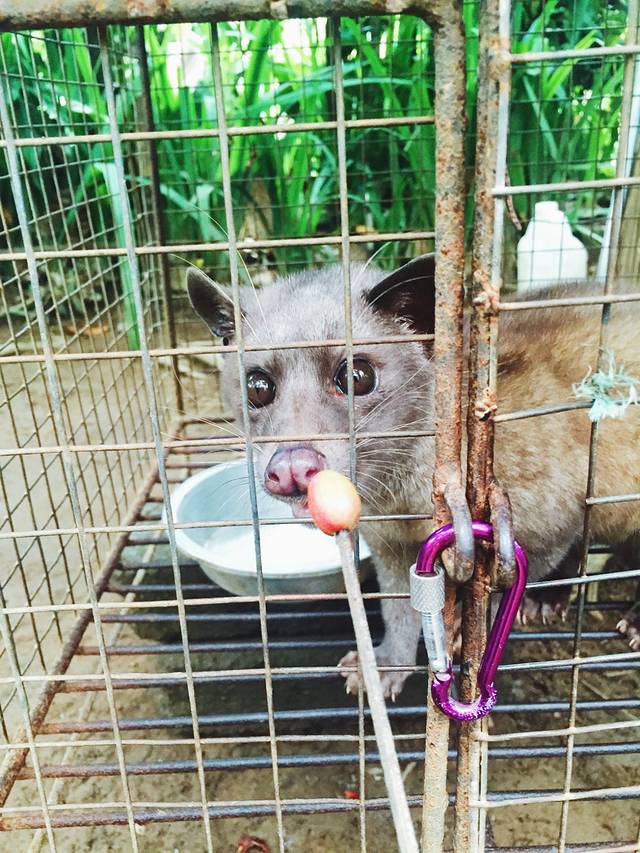 重点来啦,这个长着猪鼻子的小东西就是麝香猫,它们吃下咖啡果实,然后会把外面的皮给吐出来。喂的时候小心啊,说它们会咬人。