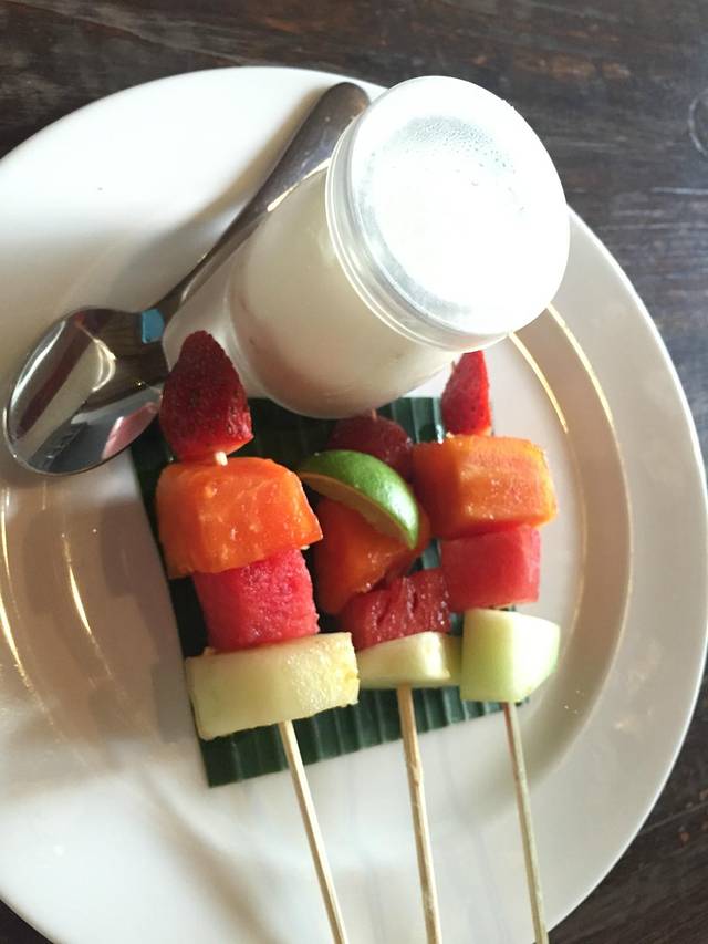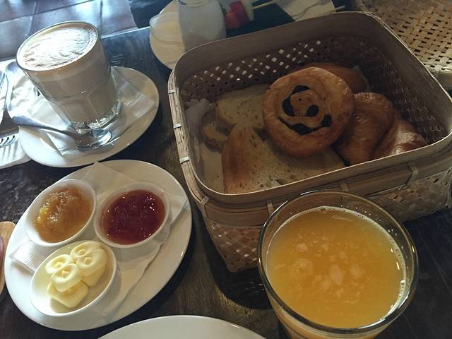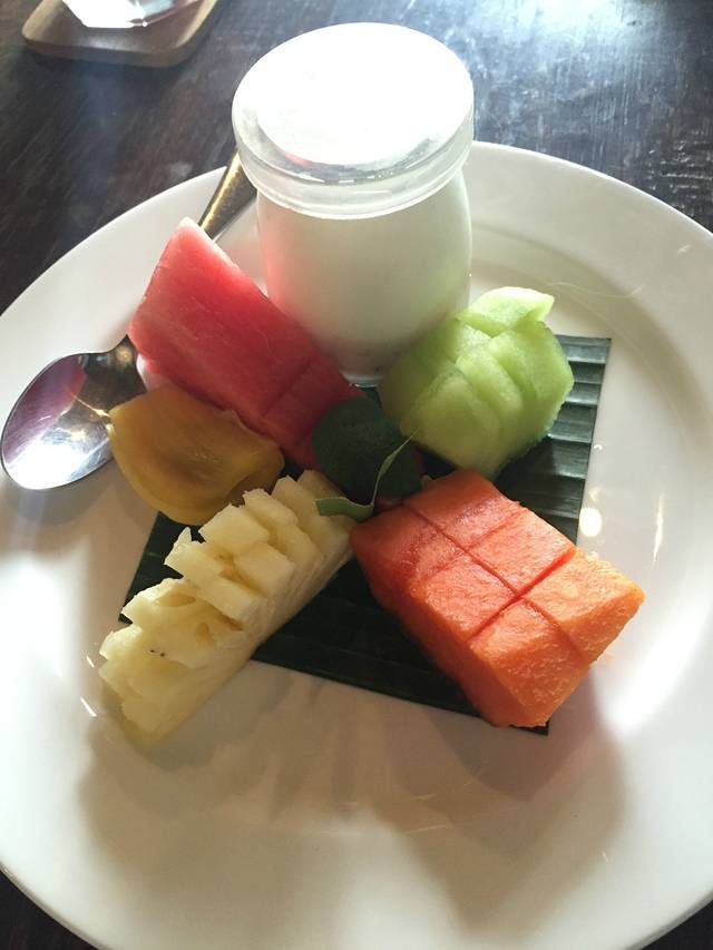 有3种还是4种早餐供选择——美式的、印尼式的、清新的啥啥的。一个个上来种类很全,还有酸奶喝pancake,比自助的感觉好多了。