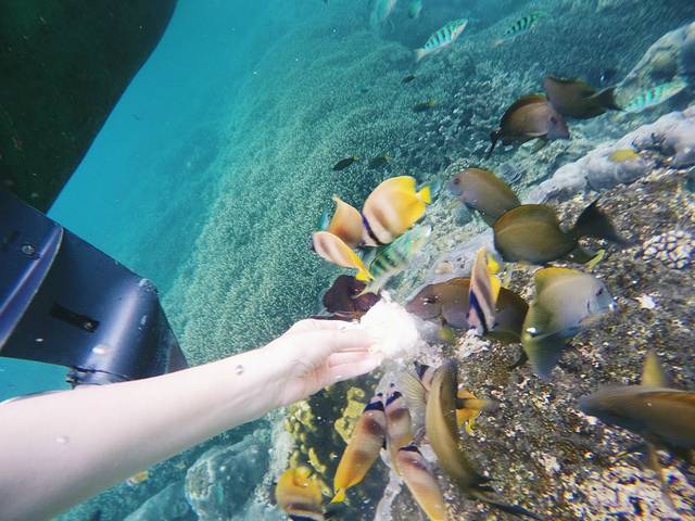 鱼超级多,爷爷会在船上扔小面包,然后鱼都被吸引过来啦
