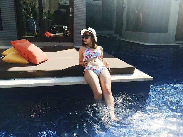 回酒店之后赶紧换上泳衣在薄荷绿色的泳池里玩了一下。