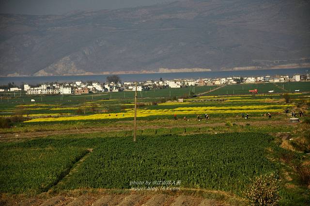 路边的菜花黄,在远处的一条蓝带,便是一路相伴的洱海。