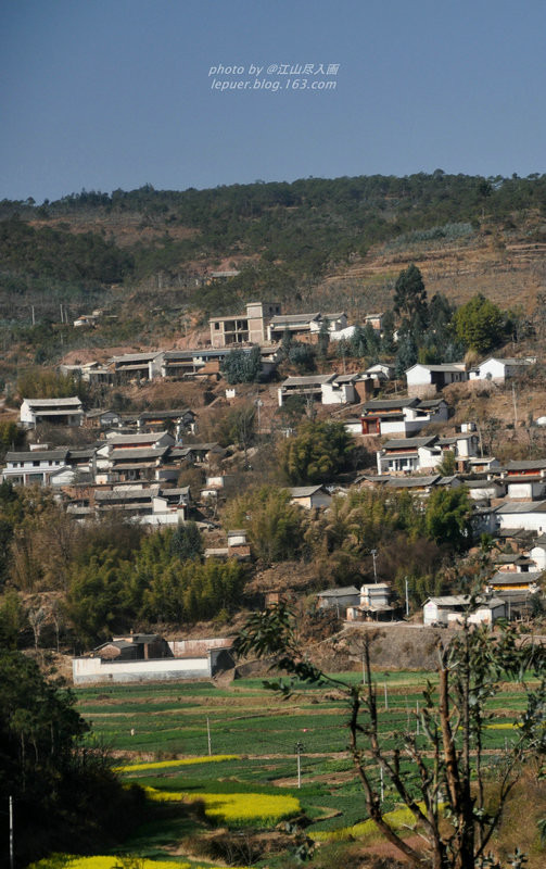 楚雄的一处彝族村寨,彝族村寨通常都建于半山腰,山脚下一片片油菜花,宛若村寨的花色裙裾