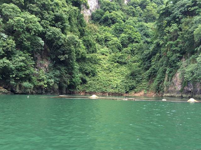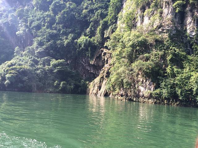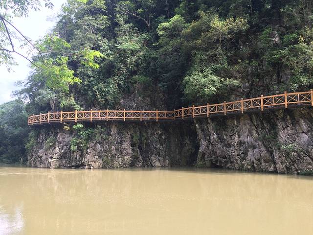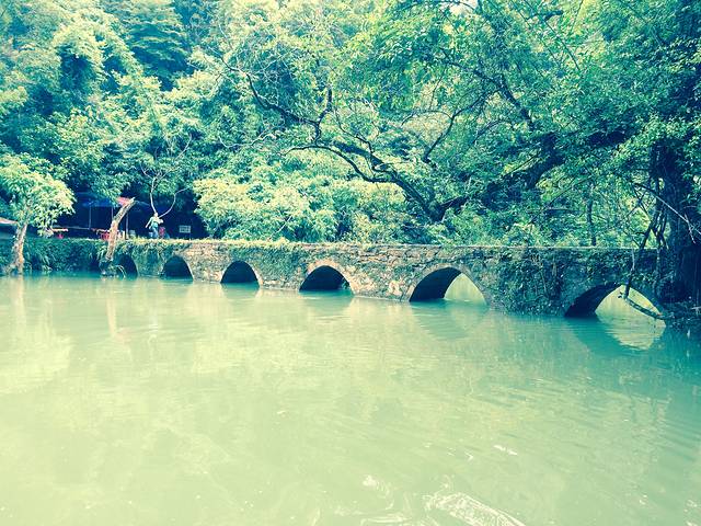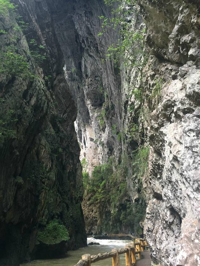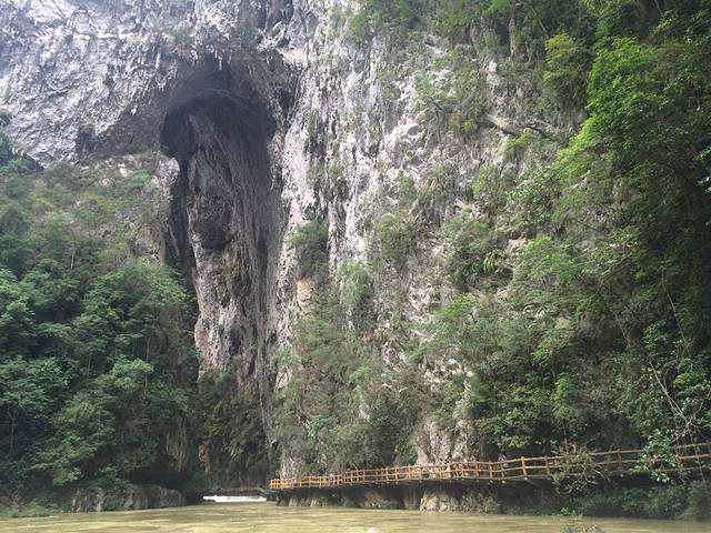 差不多4点多吧,吃过饭后在马路边等车去大七孔,每个人5元钱。最晚一班车是到5点左右。大七孔景区是可以寄存行李的。景区就一条路线,由于下过大雨,是不能坐船的,建议大家先走路过去,回来的时候在坐船。大七孔非常的小,我们当时大约1个半小时就看完了。游览顺序是恐怖峡--天生桥--妖风洞。妖风洞比较一般,如果怕远可以不去。进入景区后就是恐怖峡,右边的栈道一面靠山,一边临水,弯弯曲曲,凹凸不平。走到栈道一半时候,可以看到天生桥,这被称为东方凯旋门。如果没有下雨时候,大七孔水是蓝色的,可是我们去的时候都是黄色的了,没办法雨季啊。回去的时候已经没有车了,建议大家路边招手拦车,有位置的话司机都会让大家坐的。回到住处,简单找个农家乐吃饭,睡觉。准备明天的小七孔