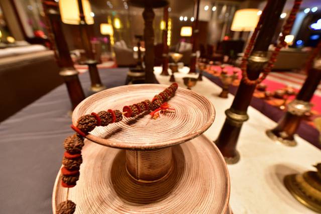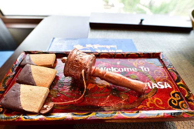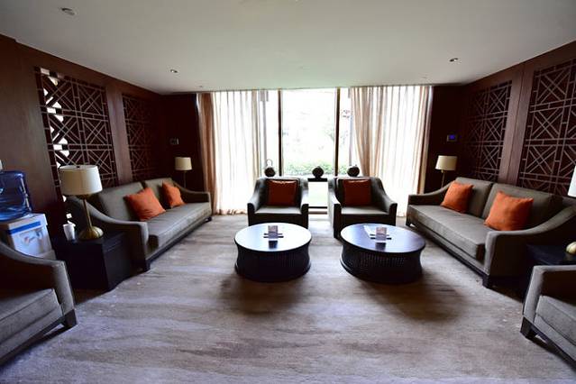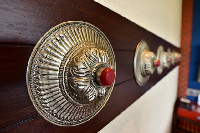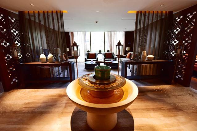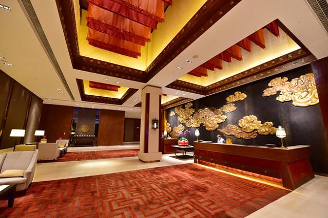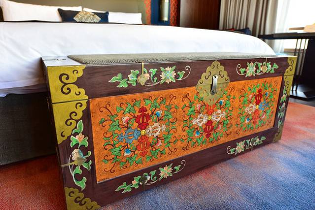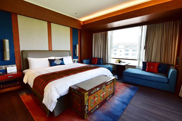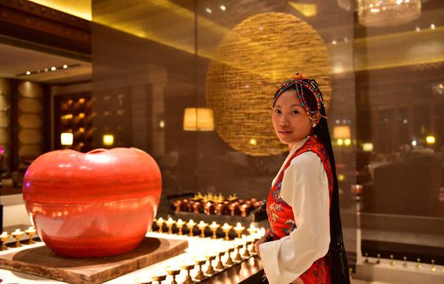 和所有香格里拉酒店一样,拉萨的香格里拉酒店也是无处不在的融合的当地的元素,大堂前台背景以飘渺的祥云图案作为背景,灵感源自西藏传统图饰,以氧化青铜片锤铸制成。在配以身着西藏传统服装的藏族或者汉族工作人员,浓浓的“藏香”扑鼻而来。