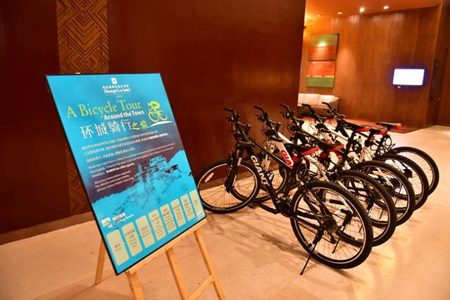 在大堂一角,我发现了几辆很新的山地车,还有一个写着“环城旅行之旅”的介绍海报。原来在拉萨香格里拉酒店,入住豪华阁的客人可以免费借用自行车骑行,其他房型的客人付一定的费用,也可以使用自行车。这真是太方便了,因为酒店距离拉萨主要景点很近,比如到布达拉宫骑行约10分钟,到离酒店最近的景点罗布林卡骑行只要5份钟左右,于是我决定第二天骑自行车继续我的拉萨闻香之旅。
