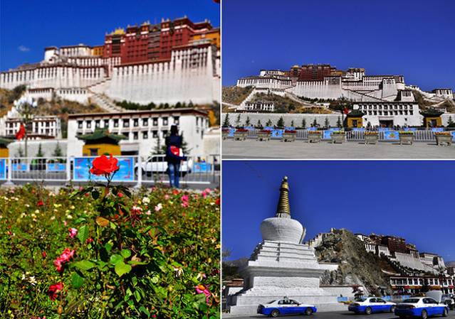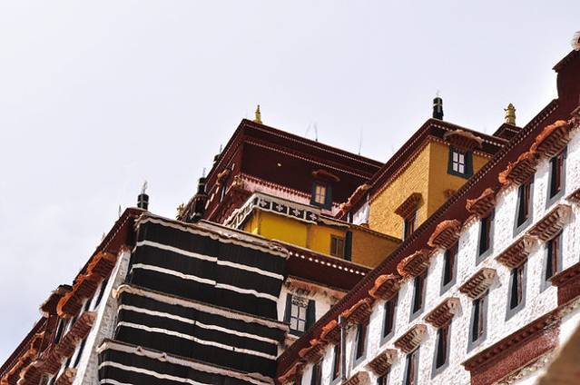 布达拉宫由红宫、白宫两大部分组成,红宫居中,白宫横贯两翼,红白相间,群楼重叠,是集宫殿、城堡、陵塔和寺院于一体的宏伟建筑。