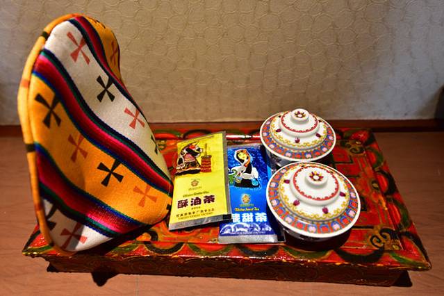 藏式的托盘上摆放着藏式盖碗茶、酥油茶包和甜茶包。。。