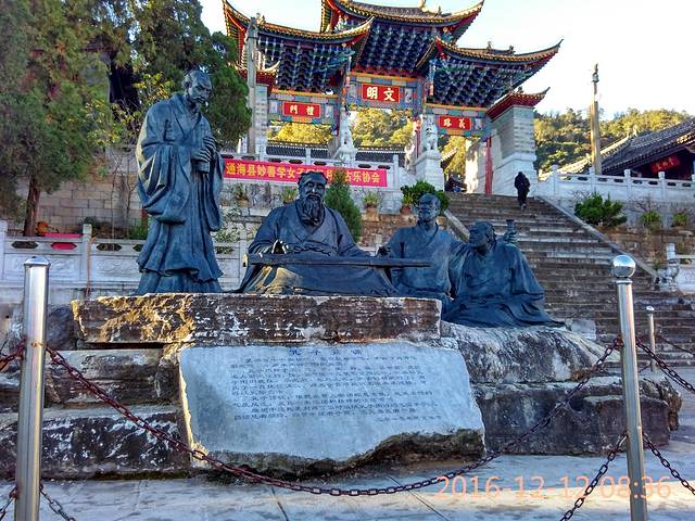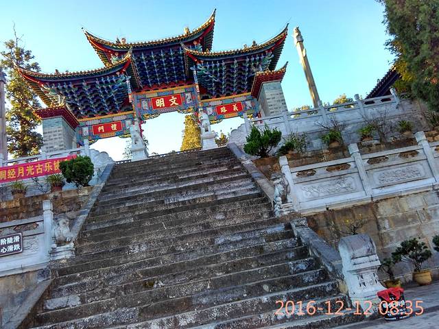 通海文庙位于云南省通海县城南隅、坐落于秀山之麓,南北向。为中轴线分幢迭起单体组合式古建筑群,由红墙(长65米、厚1.9米、高8米)泮池、文明坊、忠烈祠、节孝祠、大城门、乡贤、名宦祠、东庑、西庑、大城殿、钟鼓楼、崇圣祠、尊经阁组成,总占地1.2万平方米。