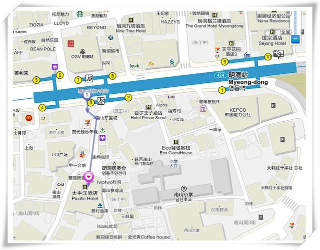 堵车加上远距离,抵达明洞已经八点多。入住地点是首尔太平洋酒店,就位于地铁明洞站3号出口旁,明洞商业区入口正对面。要逛街,走路五分钟就到。