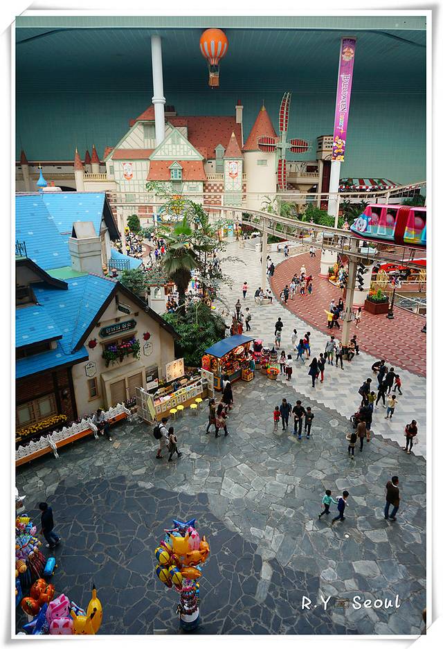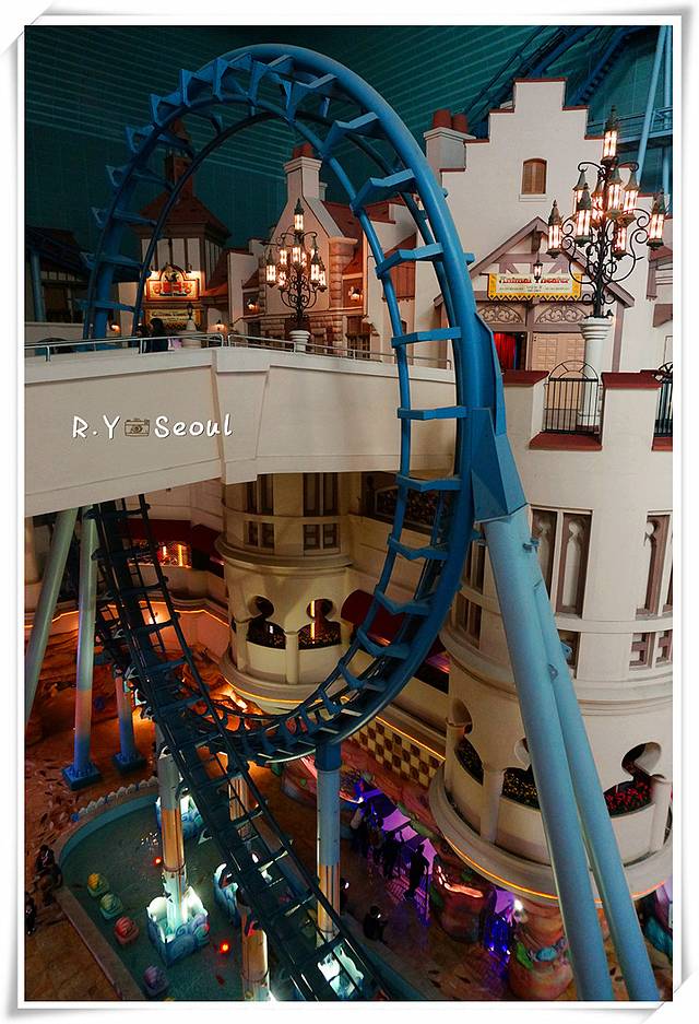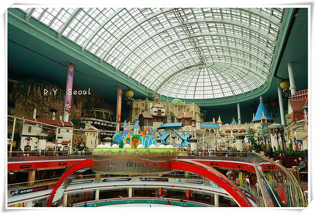 乐天世界的通票是46000韩币一个人,不过我真心建议提前在韩巢、韩游等网站上先预购好——可不仅仅是比较便宜哦。因为在排队的时候我百无聊赖,就把韩巢网的打印预约单和护照一起先拿在手里。没想到门口的保安一看见就走过来,示意我不用排队,到上图大门入口左手边,有一个专门接待预约客人的地方提前办理。在那里我只等了一组就排到了,而且也不需要护照,直接凭预订单,两张门票妥妥到手!因为提前入场,还帮我节省了好多排队等候游乐设施的时间,耶耶耶耶耶!先进入的是室内区域,像温室大棚一样的弧形玻璃屋顶,地面上的部分有四层楼高。即使阴天,也依然是五彩斑斓的童话世界。