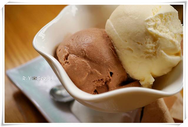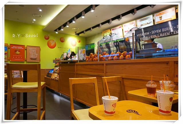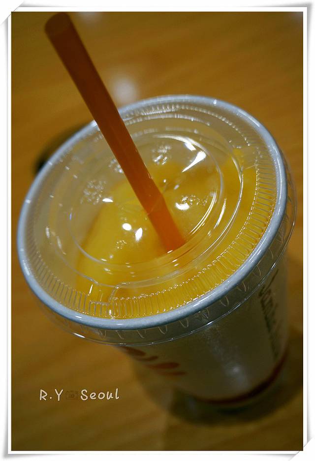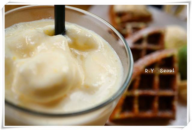 点了一份抹茶松饼,双球冰淇淋加综合水果奶昔,两个人消费两万多韩币,换来一段美味又愉快的时光。在首尔的几天里,我发现这里的食物有个特点,就是宣传图片与实物大多堪称一模一样,而在这点上,有些地方就呵呵呵呵了……