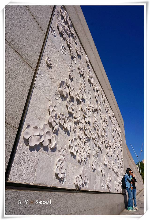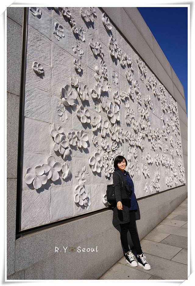 梨大门口的梨花墙是毋庸置疑的地标,但实际看到,却发现它并没有我想象中那么大,更绝不是国内常见的满墙石刻。正确的大小大约是图片里这样吧,有人做参照物,感受应该可以更明晰些。我去的时候还早,但梨花墙前已经有不少妹纸在争相合影,等我逛完梨大出来,这里已经找不到片刻可以单独和梨花墙合影的机会了,能占住两瓣花就不错了……大家好,我今天扮演的是纯情女大生!什么,完全看不出来?好的,大家再见!