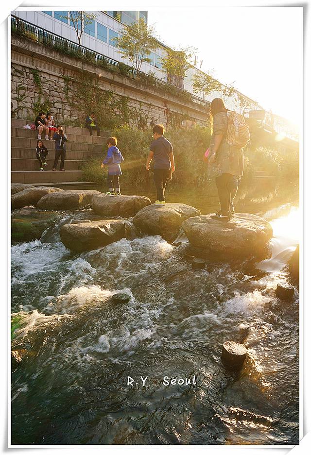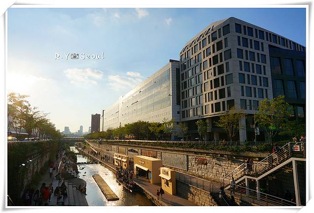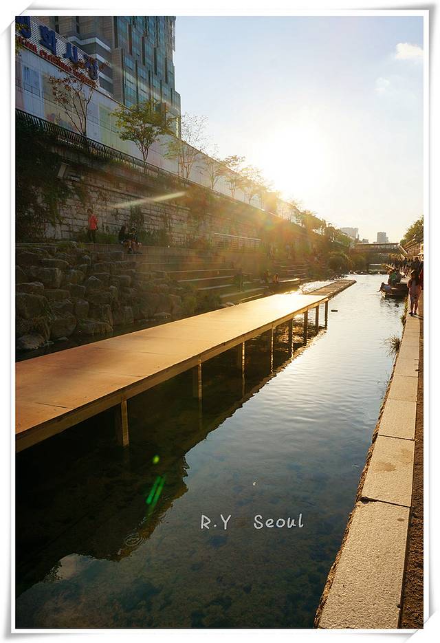 只能说这个遭遇来得太美好,因为虽然没赶上夜景,但夕阳下的清溪川已经漂亮到翻倒。溪水清澈见底,金色的波光粼粼,溪边有人在散步、闲坐、聊天、约会,一派静谧温柔的景象。